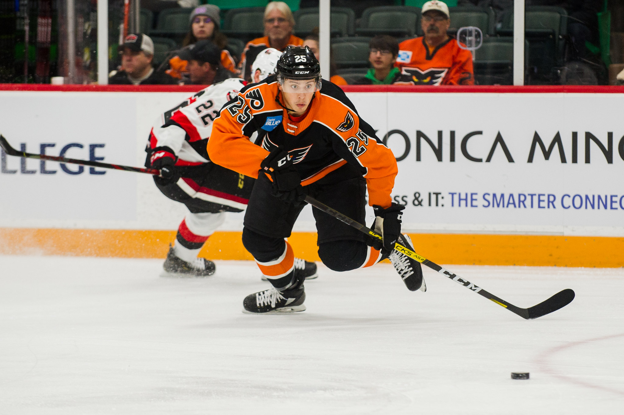 The Phantoms took a gamble with under three minutes to play, pulling Alex Lyon for the extra attacker hoping to tie the game. The gamble failed as Alex Formenton (15) put the game away 5-3 with assists from Morgan Klimchuk (4) and Filip Chlapik (7). The Phantoms played their hearts out in this game, having much more energy than in previous games; however, they fell short to the Belleville Senators 5-3. The Phantoms have now lost six straight games.