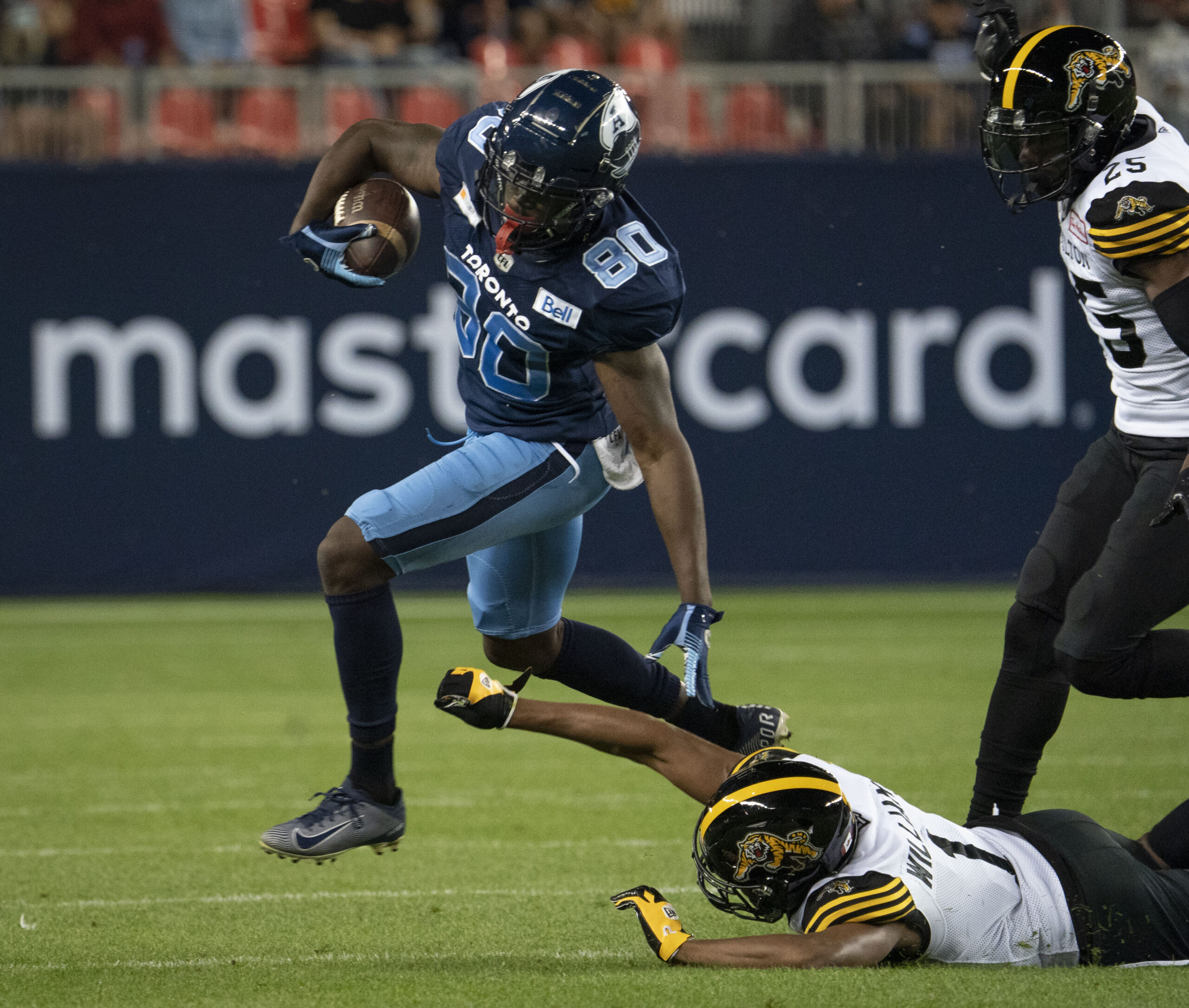 On the third play, quarterback Nick Arbuckle tossed the ball to D.J. Foster, who fought off a couple of Tiger-Cats players and scored for a 40-yard touchdown. The Argo’s lead was now 14-0 with 13:04 left in the second quarter.