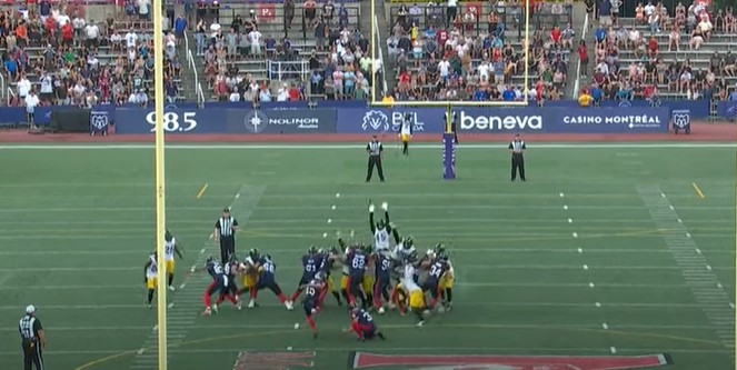 In the third quarter, Montreal set up a hitch screen when Trevor Harris quickly threw a pass to Kaion Julien-Grant, who followed his blockers and took off for a 54-yard touchdown, putting Montreal back on top 18-11 with 10:54 left.