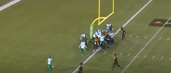 In the fourth quarter, Saskatchewan forced a two-and-out. After a scuffle between the two teams, Saskatchewan moved the ball a bit but ran into a dead end and punted the ball back to Hamilton. The Ticats’ offense took their time making small gains, leading to a 29-yard field goal by Seth Small for an 18-14 lead with 2:21 left.