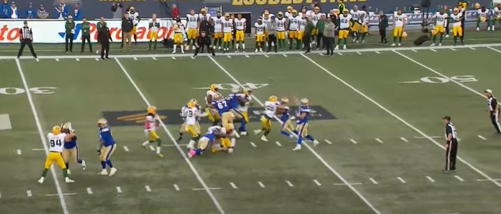 After the Elks went two-and-out, Winnipeg moved the ball, led by Zach Collaros throwing three passes for 44 yards and a couple of runs by Brady Oliveira for ten yards as the first quarter ended, and Winnipeg faced second down on Edmonton’s 25-yard line to begin the second quarter.