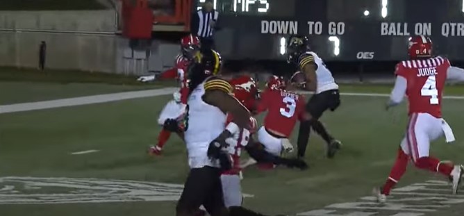 Then, Calgary caught Hamilton sleeping when Rene Paredes made an onsides kick recovered by Tyson Middlemost and ran for 24 yards before being pushed out of bounds on Hamilton’s ten-yard line. The Stampeders faced second down to begin the fourth quarter.