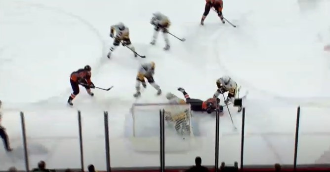 The Phantoms had done a good job keeping the Penguins off the board until with 5:46 left when several Penguins players took a shot before Valtteri Puustinen (3) finished the play going top shelf past Sam Ersson’s right side, tying the game 1-1.