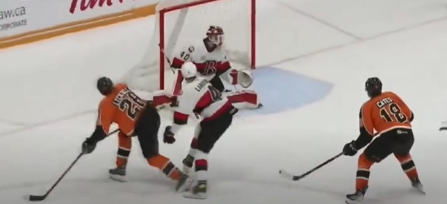 In addition, the Senators got a five-on-three penalty on a tripping call against Olle Lycksell. One second into the power play, the Senators took a 2-0 lead after Egor Sokolov (7) made a cross-ice pass to Rourke Chartier (6) for a one-time shot through the five-hole with 4:57 left. Cory Conacher (1) picked up the secondary assist.