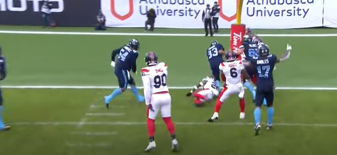 On the next play, Montreal’s defense was expecting a quarterback sneak by Chad Kelly. However, Toronto’s offense faked the sneak, and Kelly threw a 46-yard touchdown pass to DaVaris Daniels for a 21-3 lead with 9:20 left.