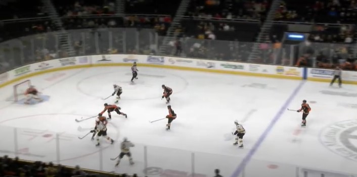 Early in the third period, Sam Ersson made a terrific diving save to block Jakub Lauko’s shot. Then, the Phantoms broke the tie with 11:48 left after Isaac Ratcliffe (2) scored his second goal from the right slot through the five-hole. Ronnie Attard (4) did a tremendous job to draw a couple of Bruins players away from Ratcliffe to set up his goal for a 3-2 lead.