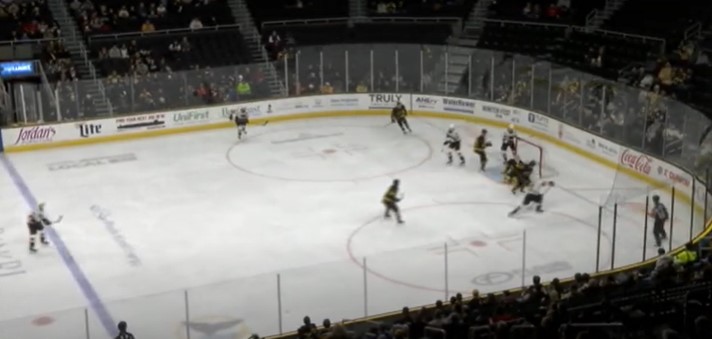 Elliot Desnoyers (4) won the faceoff battle as Cooper Marody (5) got control of the puck. Then, he passed the puck to Adam Ginning (1) for a thunderous shot through the five-hole, tying the game 4-4 with 8:03 left. It was Ginning’s first career AHL goal.