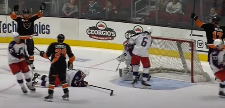 With a little over a minute left. Louie Belpedio broke up a play by Owen Sillinger. Artem Anisimov (8) got the puck and started to rush toward the Monsters’ zone. He missed the first shot but rebounded the puck. As three Monsters players started to crowd Anisimov. Cleveland left Louie Belpedio (4) all alone and Anisimov found Belpedio and he zipped the puck past the left skate of Jet Greaves and into the net for a game-winning 2-1 win. Olle Lycksell (19) got the secondary assist. It wasn’t easy, but the Phantoms got the job done.