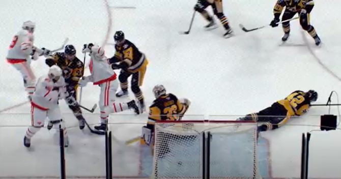 Garrett Wilson (14) passed the puck to Artem Anisimov (10) before he found Egor Zamula (1). Zamula pelted the puck with velocity and it went over the left pad of Taylor Gauthier and into the net. It was now 2-1 Penguins with 16:55 left.