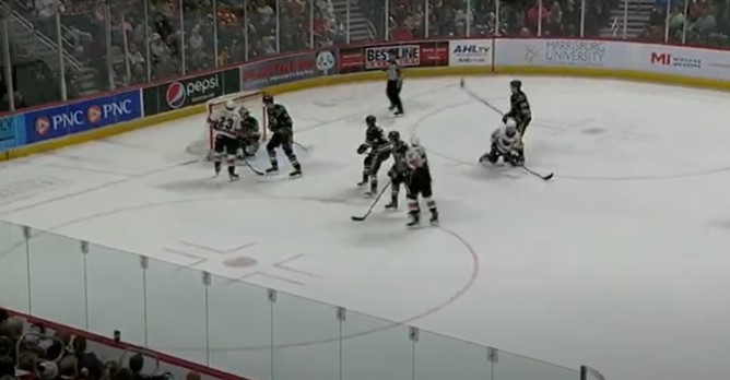 In the third period, the AHL officials dictated this game. Thirty-three seconds into the third period, Hershey extended their lead to 3-1. Ethen Frank’s (17) shot went off of Maier’s right shoulder and Mike Vecchione (24) made a high stick pass to Mike Sgarbossa (18) and he scored the goal. There were four officials in the vicinity and they did not wave the goal off. The goal should not have counted.