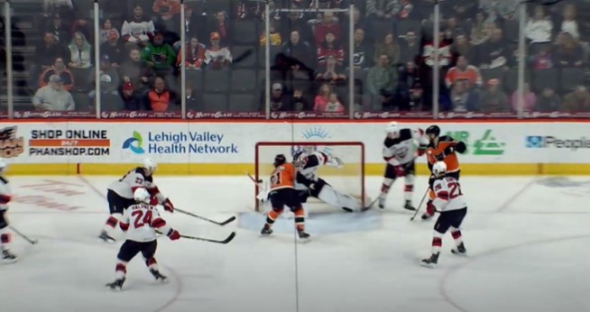 Eight minutes and fifty-six seconds into the second period, the Phantoms scored. Adam Brooks (15) made a wonderful cross-ice pass to Tyson Foerster (19) with a highlight reel backhand flick over Jake Theut’s left pad and into the net. It was 1-0 Phantoms with 11:04 left.