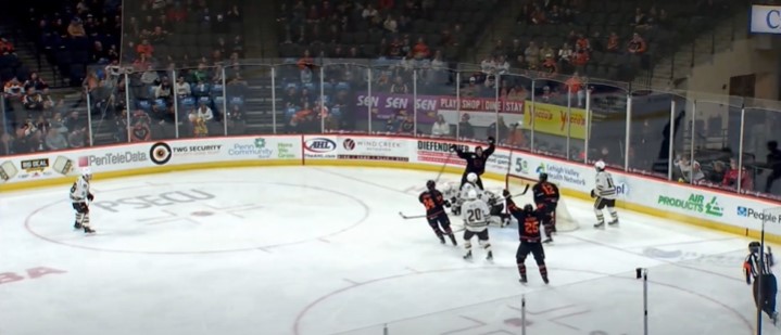 Six minutes and five seconds later, the Phantoms tied the game. Cooper Marody (20) won the faceoff inside the Phantoms’ zone. The puck went to Adam Ginning (14) and he fired it off the end boards but Garrett Wilson (13) was there for the rebound and whisked it through the five-hole and into the net. The game was tied 1-1 with 12:02 left.