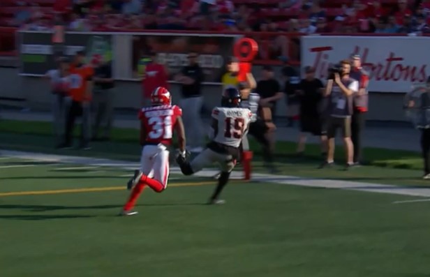In the fourth quarter, quarterback Vernon Adams Jr. threw two passes for 24 yards to Dominique Rhymes and Lucky Whitehead before Taquan Mizzell made a two-yard gain on Calgary’s five-yard line. On the next play, Vernon Adams Jr. used his legs to score a touchdown for a 21-6 lead with 11:32 left in the game. On the kickoff, B.C. picked up another single point for a 22-6 lead with 11:29 left.