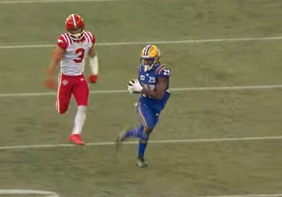 On the second play, Zach Collaros made a great pump fake which got Calgary’s secondary to bite before throwing a 68-yard touchdown pass to Greg McCrae. The game was tied 11-11 with 1:30 left.