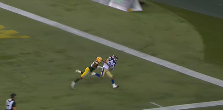 On the third play of the fourth quarter, Dru Brown stepped back to throw a 32-yard touchdown pass to Kenny Lawler, who made a great one-handed catch with a defender on him to give the Blue Bombers its first lead of the game 31-29 with 13:30 left.