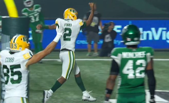 After Edmonton’s defense forced a two-and-out, the offense went to work. On the second play, quarterback Tre Ford threw a deep pass to Eugene Lewis for 38 yards. Three plays later, Ford took off for a gain of ten yards. Shortly after, Ford scrambled down the middle for a ten-yard touchdown to put Edmonton ahead 34-27 with 5:35 left of the game. It was Edmonton’s first lead of the game.