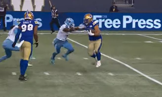 Winnipeg’s defense made quick work to force a two-and-out to give the ball back to the offense. Winnipeg’s offense marched down to the Argonauts’ two-yard line before Dakota Prukop finished the drive with a two-yard touchdown to give the Blue Bombers their first lead of the game. They failed to get a two-point conversion and the score was now 25-21 with 3:12 left in the game.
