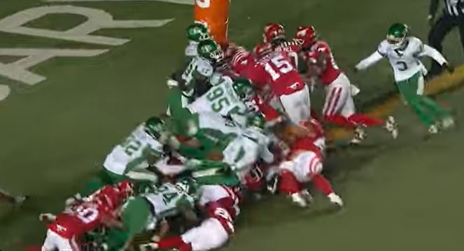 Late in the fourth quarter, Saskatchewan quarterback Jake Dolegala needed to convert a 3rd and 15 but decided to run the ball but was well short of the first down. Saskatchewan’s offense fell apart in the final three minutes of the game and the Stampeders won the game 26-19.