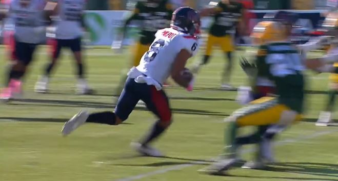 The turning point of the game on Edmonton’s next drive. Montreal defensive end Lwal Uguak punched the ball out of Tre Ford’s hand before Mustafa Johnson scooped it up for a 38-yard touchdown. It was now 21-17 Edmonton with 2:40 left of the second quarter.
