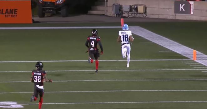 Later in the first quarter, Toronto quarterback Cameron Dukes threw a deep pass to Dejon Brissett for a 61-yard touchdown. Ottawa defensive back Monshadrik Hunter turned his head to see what Dukes was doing but ended up losing ground to Brissett which resulted in a touchdown. It was now 14-0 with 2:04 left of the first quarter.