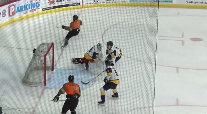 A minute and fifty-nine seconds into the first quarter, Justin Robidas put the Admirals up 1-0 with assists from Ronan Seeley and Yaniv Perets. A minute and seventeen seconds later, Reading’s Yvan Mongo tied the game 1-1 with assists by Brendan Hoffmann and Connor Fedorek. The Royals had six shots on goal but the game remained tied 1-1 after one period.