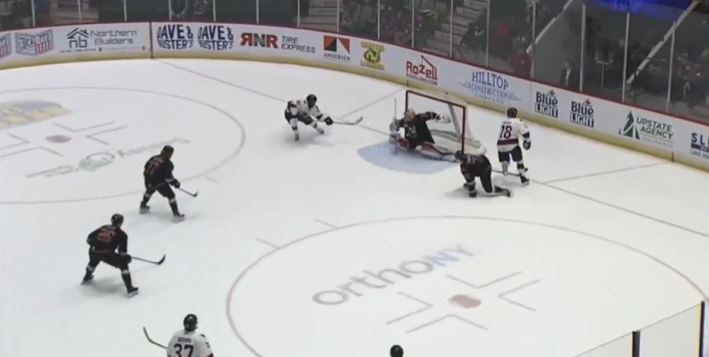 At 13:53 of the first period, Adirondack’s Patrick Grasso put the Thunder up 1-0. Late in the first period, Reading’s Yvan Mongo tied the game 1-1 with an assist by Joseph Nardi. The Royals had eight shots on goal in the first period but the game remained tied 1-1 after one period of play.