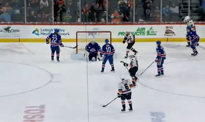 At 10:55, Rochester’s Jeremy Davies high-sticked Lehigh Valley’s Olle Lycksell in the face and he was bleeding from the nose. Usually, that is a double minor penalty but the refs only put Kozak in the penalty box for two minutes.