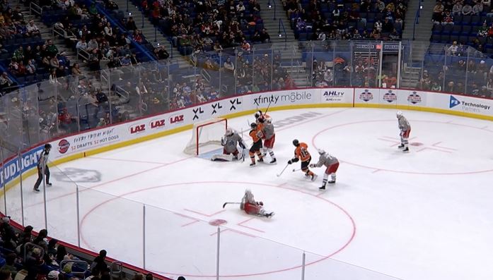 After the goal, the Phantoms generated some momentum. At 10:51, Ethan Samson (2) made a pass to Adam Ginning (5). Ginning found J.R. Avon (4), who dangled around Brett Berard before rifling the puck over the right shoulder of Louis Domingue and into the net. It was now 4-1 Hartford.