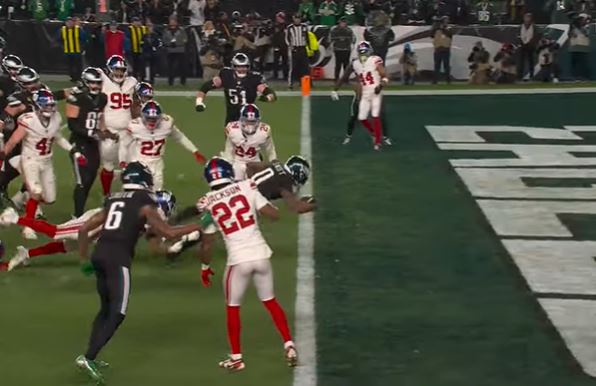 Late in the third quarter, Philadelphia quarterback Jalen Hurts attempted to complete a pass to Dallas Goedert but Adoree’ Jackson intercepted it for a 76-yard touchdown. The Giants converted a two-point play which made it 20-18 with nine seconds.