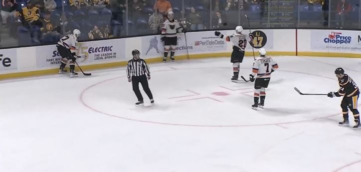 At 12:19, Wilkes-Barre’s Corey Andonovski (11) passed the puck to Jack St. Ivany (6). Ivany held onto the puck for a couple of seconds before shooting it near the blue line which was tipped in by Matt Filipe (4) through the five-hole for a 1-0 lead with 7:41 left of the first period.