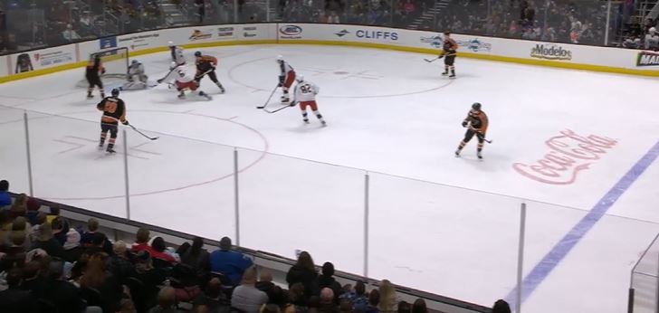 At 10:14, Cleveland’s David Jiricek (3) passed the puck to Brendan Gaunce (10), who was near the goal net. Then, Gaunce turned around to shoot the puck but Sandstrom blocked it. There was a traffic jam in front of Sandstrom where Carson Meyer (15) jammed it into the net giving Cleveland a 3-2 lead with 9:46 left.
