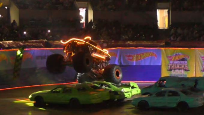 The Hot Wheels Monster Trucks Live Glow Party Tour made its way to the CURE Insurance Arena in Trenton, New Jersey. Bone Shaker, Bigfoot, Tiger Shark, 5 Alarm, Gunkster, Mega Wrex, and Demo Derby compete in wheelie contests, donuts, long jump, and freestyle.