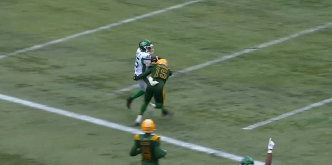 With 38 seconds left, Edmonton quarterback McLeod Bethel-Thompson’s pass was intercepted by C.J. Avery in what looked to be game over. However, Saskatchewan running back A.J. Ouellette fumbled the ball and Darrius Bratton recovered giving Edmonton another chance from their 51-yard line. Bethel-Thompson had 18 seconds to work with.