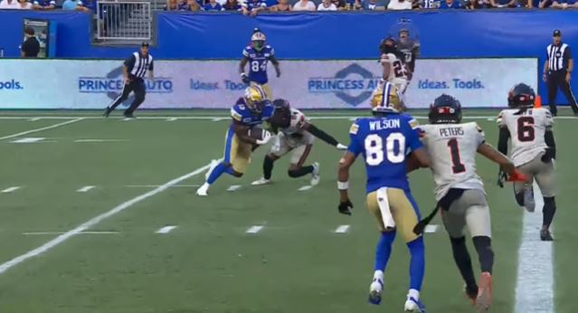 Wide receiver Ontaria Wilson made four catches for 67 yards, and Lucky Whitehead made five catches for 58 yards and one touchdown. Winnipeg’s defense made two sacks. Winnipeg was penalized five times for 41 yards. Winnipeg also dominated the time of possession (19:58).