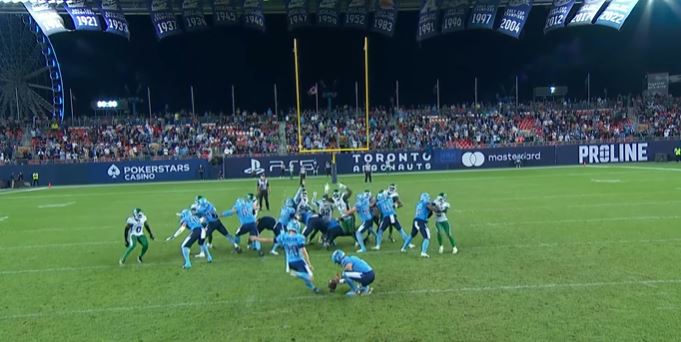 Toronto running back Ka’Deem Carey rushed for a gain of three yards before a procedure penalty on the Argonauts backed them up to their 28-yard line. Quarterback Chad Kelly threw an 11-yard pass to Damonte Coxie but they were short of the first down.