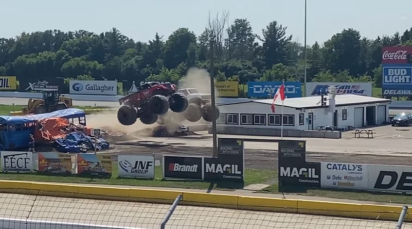 The Monster Truck Throwdown tour visited Delaware Speedway in London, Ontario, featuring the best trick competition, racing, and freestyle. The trucks that participated in the show were Axe, Avenger, Rat Nasty, Hellion, Sabotage, Spike, Psycho Pat, and Mega Bite.