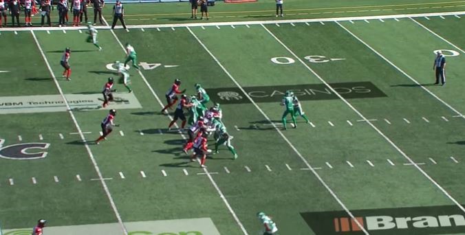 Ottawa running back Khalan Laborn started the next drive for a one-yard run to the Roughriders’ 54-yard line. On the next play, Ottawa quarterback Jeremiah Masoli’s pass intended for Justin Hardy was intercepted by Marcus Sayles. Sayles returned the interception for 8 yards before he was tackled on the Roughriders’ 43-yard line.