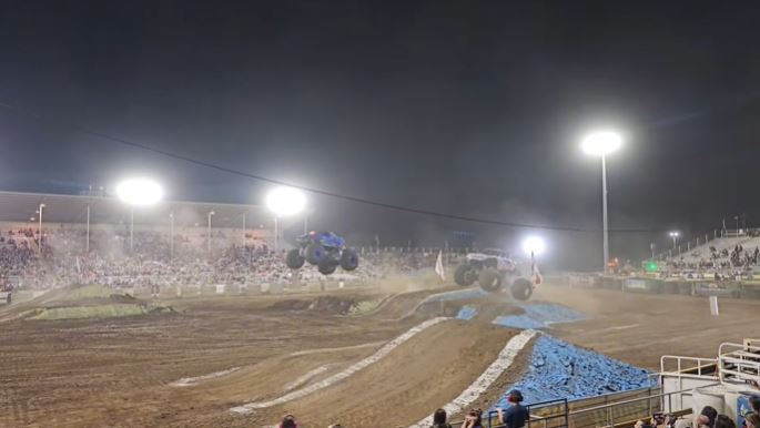 The West Coast Monster Truck Nationals tour visited the Tehama District County Fairgrounds in Red Bluff, California, featuring the best trick competition, racing, and freestyle. The trucks that competed in the show were Anubis, The Veteran, Double Trouble, Monster Moose, Obsessed, Pretty Obsessed, Rockwell Red, Kamikaze, Velociraptor, Rat Attack, and Jurassic Attack.