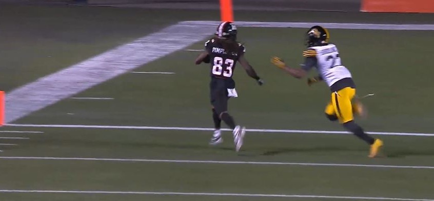 Quarterback Dru Brown completed two passes for 29 yards to reach their 49-yard line. On the next play, Hamilton got called for a defensive pass interference penalty, and Kalil Pimpleton rushed for two yards to reach the Ticats’ 26-yard line. Kicker Lewis Ward made a 33-yard field goal for a 23-22 lead with 37 seconds left. On the last play of the third quarter, quarterback Bo Levi Mitchell threw a 37-yard pass to Tim White to reach the Redblacks’ 30-yard line down 23-22.