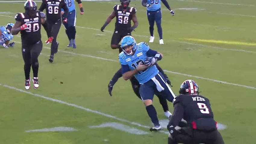 Toronto got back into the ball game when quarterback Chad Kelly threw a 70-yard touchdown pass to a wide-open Makai Polk and Toronto trailed Ottawa 13-10 with 9:04 left before halftime. Ottawa started its next possession from their 37-yard line.