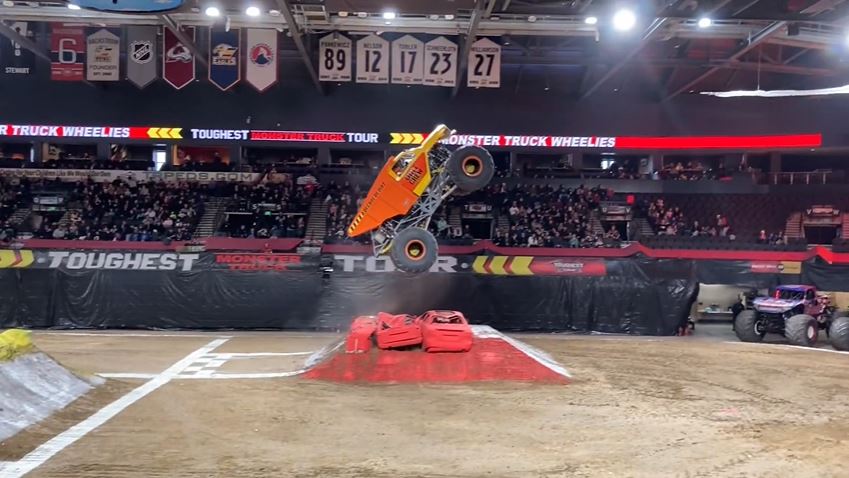 The Toughest Monster Truck Tour visited the Blue FCU Arena in Loveland, Colorado, featuring the wheel competition, racing, and freestyle. The Trucks that competed in the show were Block Head, Dirt Crew, Tailgator, The Veteran, Smashosaurus, and Cyber Attack.