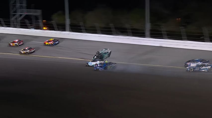Next, Bell hit Preece causing the accident. Preece’s car went airborne then landing on its roof and flipping about over before coming to a full stop. Luckily, Preece walked about from the accident. He was treated and released from the infield care center.