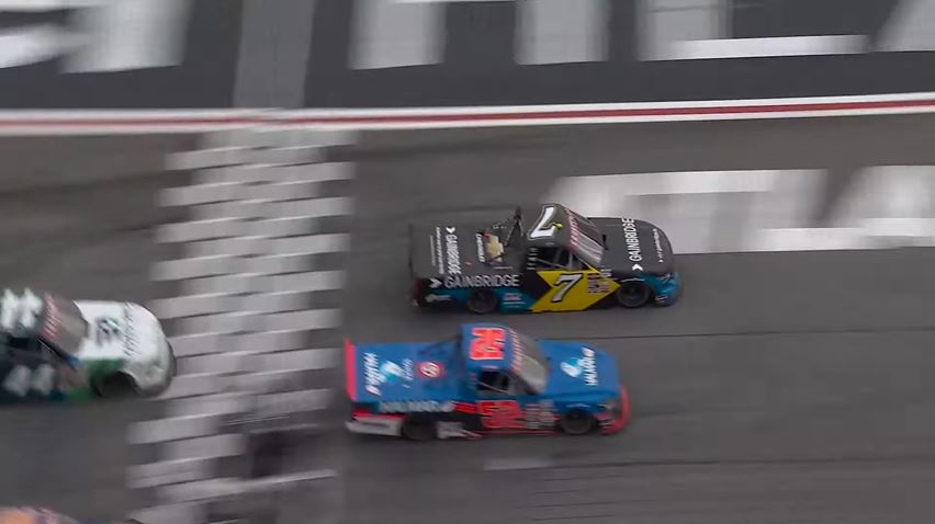 There were four cautions throughout the race. The big wreck happened on lap 75 involving six trucks including Frankie Muniz, Rajah Caruth, Tyler Ankrum, Andres Perez, William Sawalich, and Nathan Byrd. Ankrum’s truck did not suffer any major damage and was able to continue the race. The other cautions were the ends of stages one and two, and debris on lap 108.