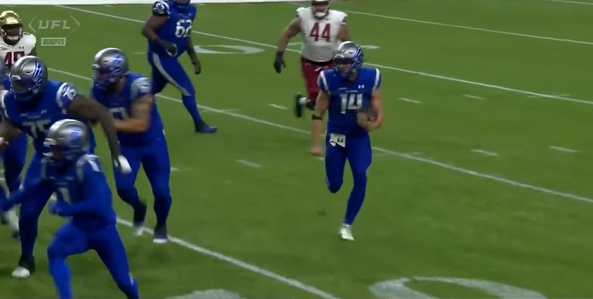 In the second quarter, St. Louis quarterback Max Duggan rushed for a one-yard touchdown to put the Battlehawks up 9-6 with 5:36 left. Late in the second quarter, Max Duggan rushed for an eight-yard touchdown plus a two-point conversion extended the Battlehawks lead to 17-6 at halftime.