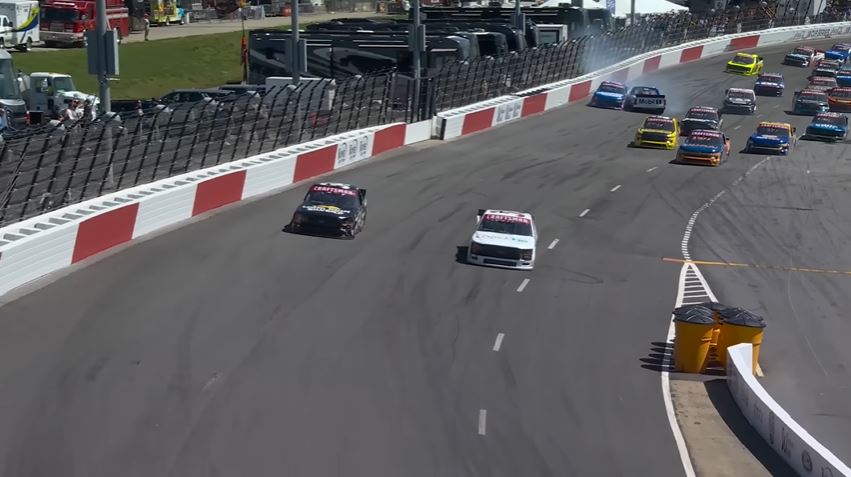 Grant Enfinger and Corey Heim were on the front row to start the final stage on lap 150. Chandler Smith bumped Enfinger exiting Turn 4 allowing Corey Heim to take the lead. Heim continued to lead the race when Tyler Tomassi’s truck lost a right front tire and made contact with the Turn 1 wall bringing out the caution on lap 211.