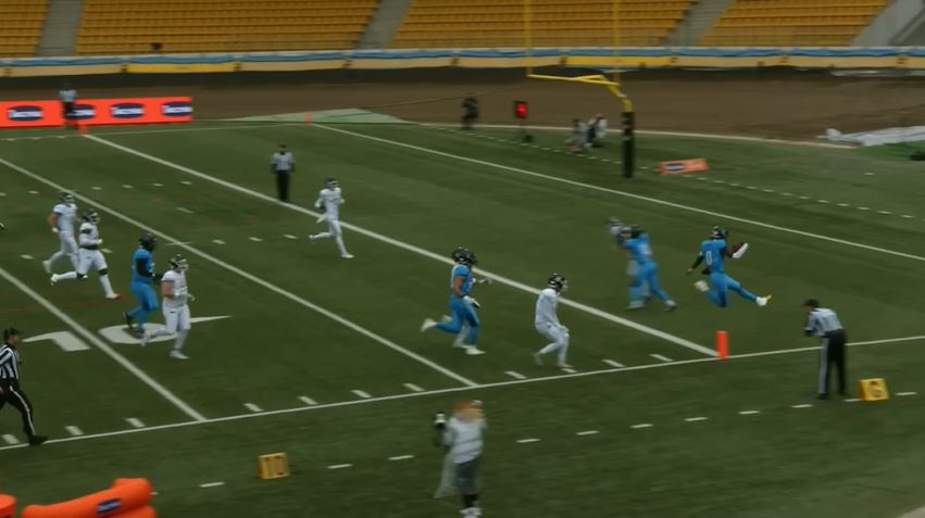 Wroclaw Panthers quarterback D.J. Irons completed 12 of 17 passes (70.5%) for 113 yards, three touchdowns, seven carries for 77 yards, and two touchdowns leading the Panthers to a 55-12 rout over the Fehervar Enthroners.