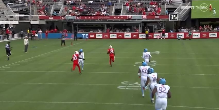 Later in the second quarter, D.C. went with a trick play when wide receiver Chris Rowland threw a nine-yard touchdown pass to Jordan Ta’amu. They did not get the two-point conversion and it was now 21-11 D.C. with 5:03 left.