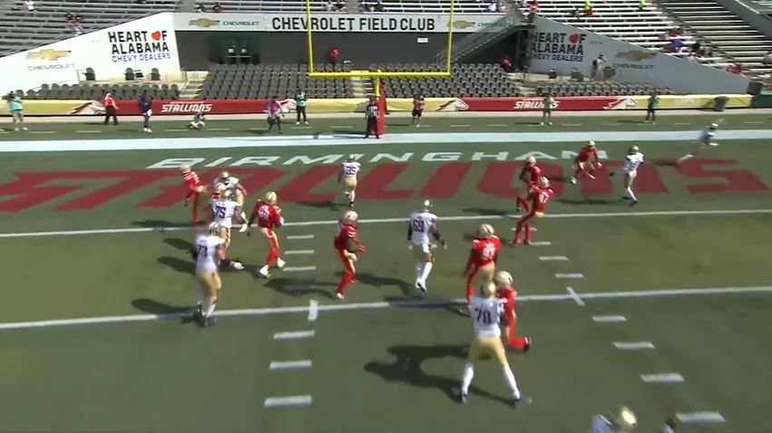 Late in the second quarter, Birmingham running back C.J. Marable scored a one-yard touchdown. Quarterback Matt Corral threw to Ricky Person Jr. and the Stallions trailed the Panthers 21-14 at halftime.