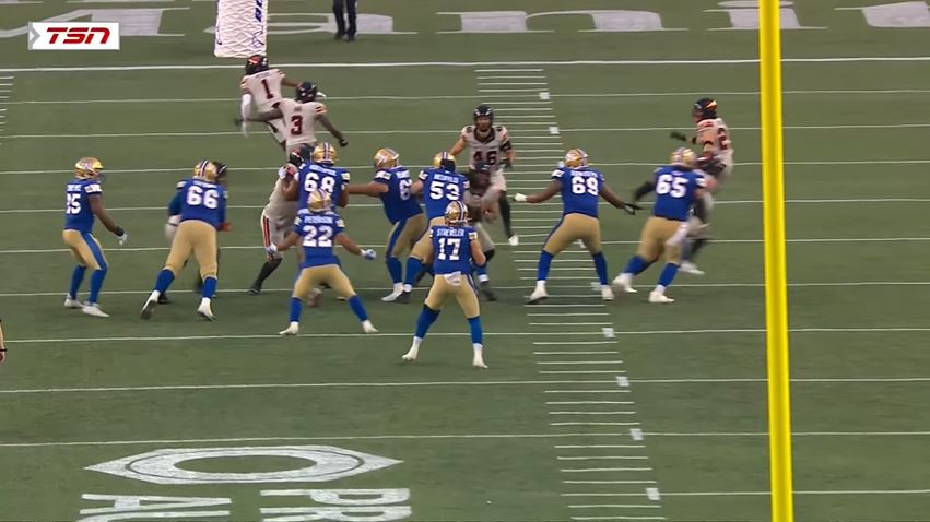 B.C. got the ball to start the third quarter. They gained 24 yards before the drive stalled and punted the ball to Winnipeg. The Blue Bombers started from their two-yard line. Running back Matthew Peterson rushed for three yards, and quarterback Chris Streveler gave them breathing room by throwing a 35-yard pass to Keric Wheatfall.