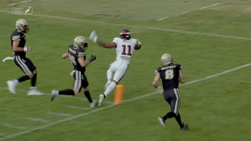 Vienna quarterback Ben Holmes completed 24 of 33 passes (72%) for 255 yards, five touchdowns, and three carries for 20 yards leading the Vikings to a 44-38 win over the Raiders. Tirol quarterback N’Kosi Perry completed 25 of 38 passes (65.8%) for 396 yards, four touchdowns, one interception, four carries for 15 yards, and one rushing touchdown.